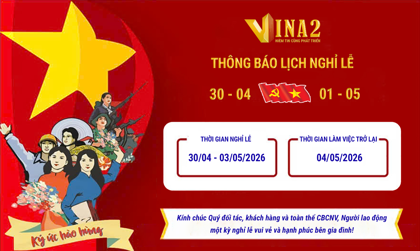 Công ty Cổ phần Đầu tư và Xây dựng VINA2, xin trân trọng thông báo tới các đối tác cùng toàn thể CBCNV và các Công ty thành viên lịch nghỉ lễ 30/4 và 01/5 cụ thể như sau: