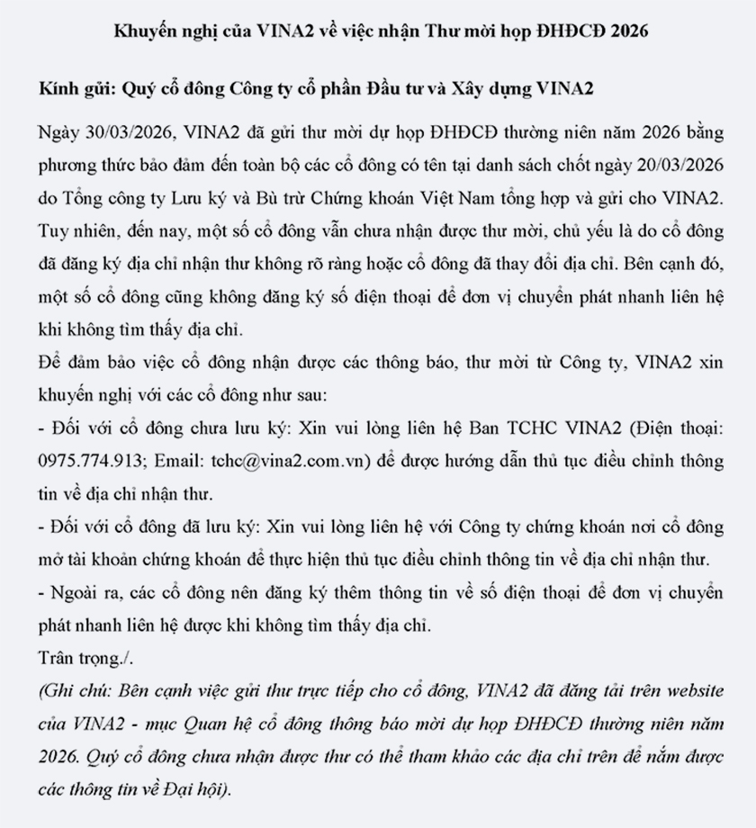 VINA2 thông báo mời họp Đại Hội Đồng Cổ Đông thường niên năm 2026